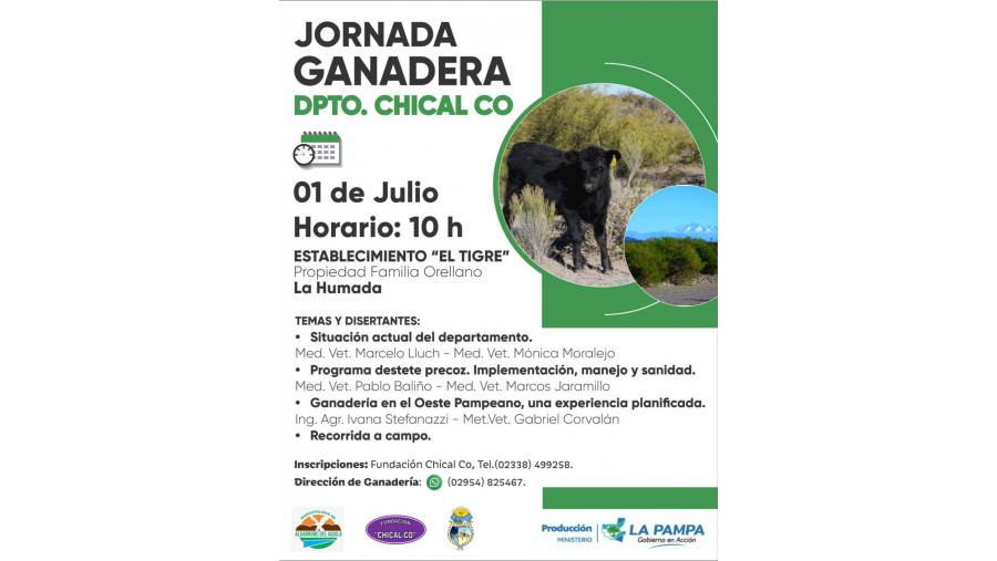 El Ministerio de la Producción llevará a cabo una Jornada Ganadera destinada a productores del oeste pampeano. La misma tendrá lugar el próximo 1 de julio desde las 10, en el Establecimiento El Tigre, propiedad de la Familia Orellano, en la localidad de La Humada. La actividad organizada por la Dirección de Ganadería, consistirá en una disertación referida a la situación actual del Departamento, a cargo de Marcelo Lluch, director de Ganadería y Mónica Moralejo. Otro tema será: Programa Destete Precoz. Implementación, manejo y sanidad, a cargo de Pablo Baliño y Marcos Jaramillo. Finalmente el tema a exponer será ganadería en el oeste pampeano, una experiencia planificada, a cargo de lIvana Stefanazzi y Gabriel Corvalán. La actividad cerrará con una recorrida a campo. Dicha jornada cuenta con el acompañamiento de los municipios de Algarrobo del Águila y de La Humada, además de la Fundación Chical Có.