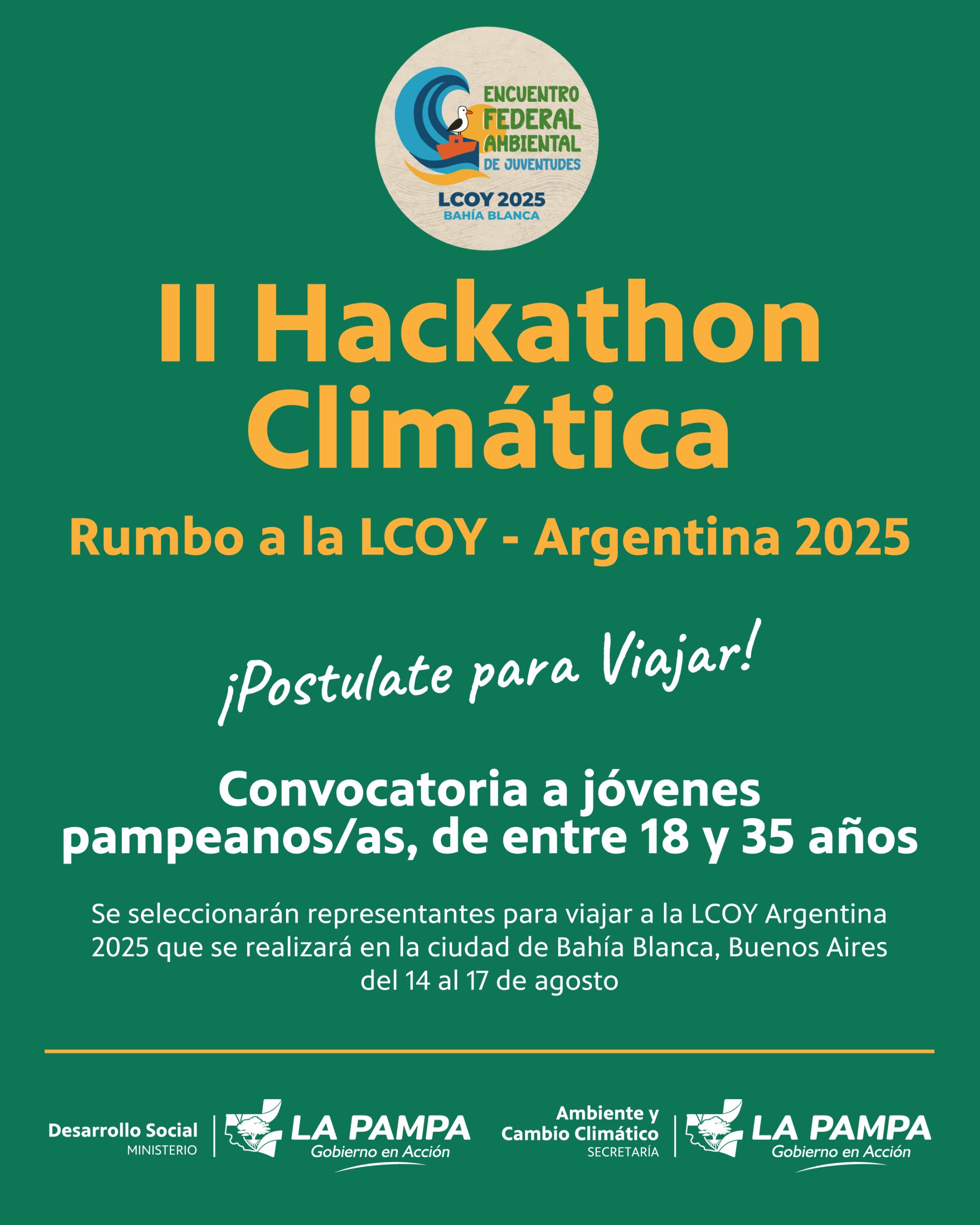 La Secretaría de Ambiente y Cambio Climático y la Subsecretaría de Juventud del Ministerio de Desarrollo Social y DDHH lanzan la segunda edición del Hackathon Climática “Rumbo a la LCOY Argentina 2025”, una convocatoria abierta a jóvenes pampeanos y pampeanas comprometidos con la acción climática y la transformación de sus territorios.