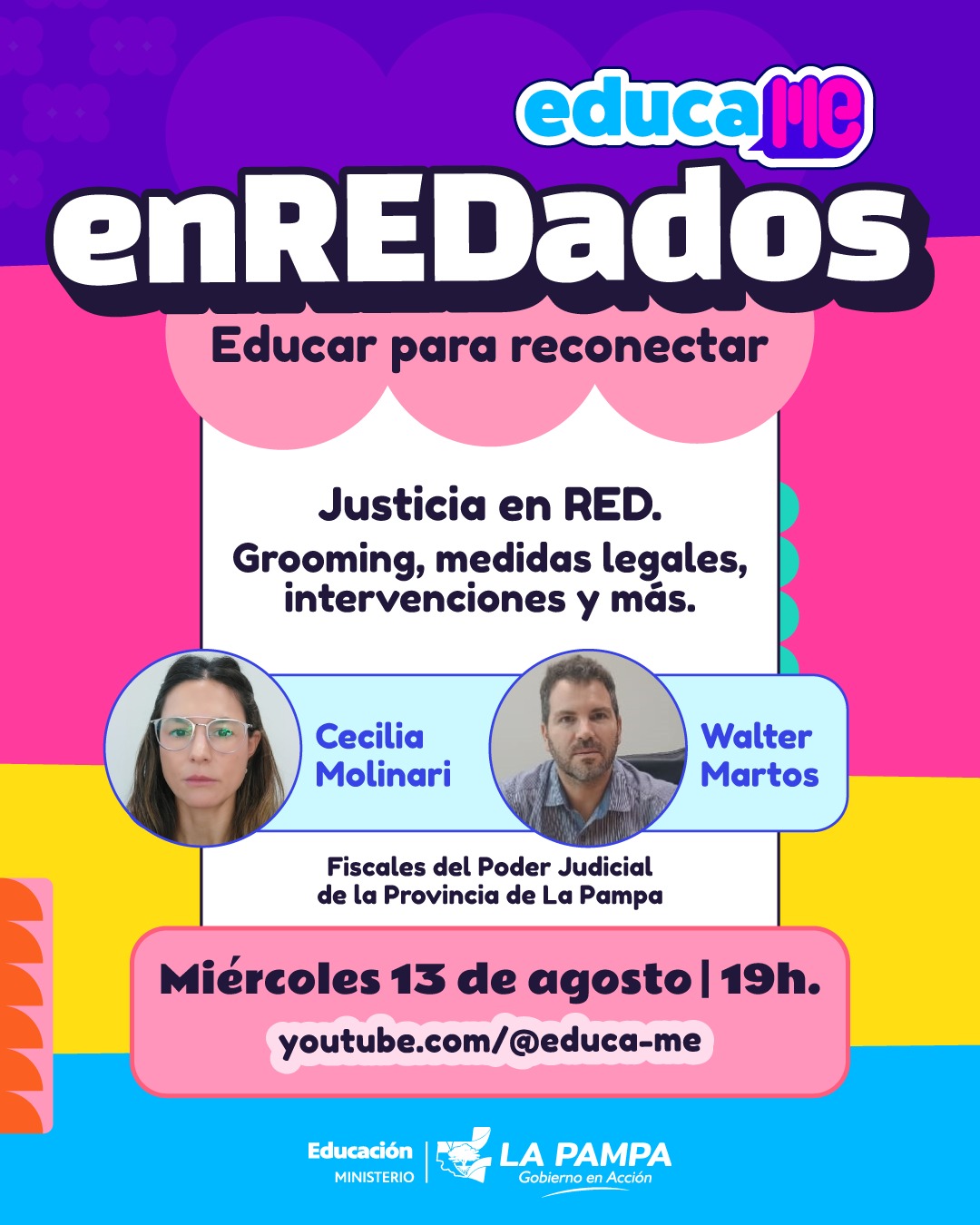 “Justicia en RED": es el nombre del episodio en el cual se hablará sobre grooming, medidas legales, intervenciones y más, con la presencia de los fiscales Walter Martos y Cecilia Molinari, ambos pertenecientes al Poder Judicial de la Provincia de La Pampa. Será el próximo miércoles 13 de agosto a las 19:00.