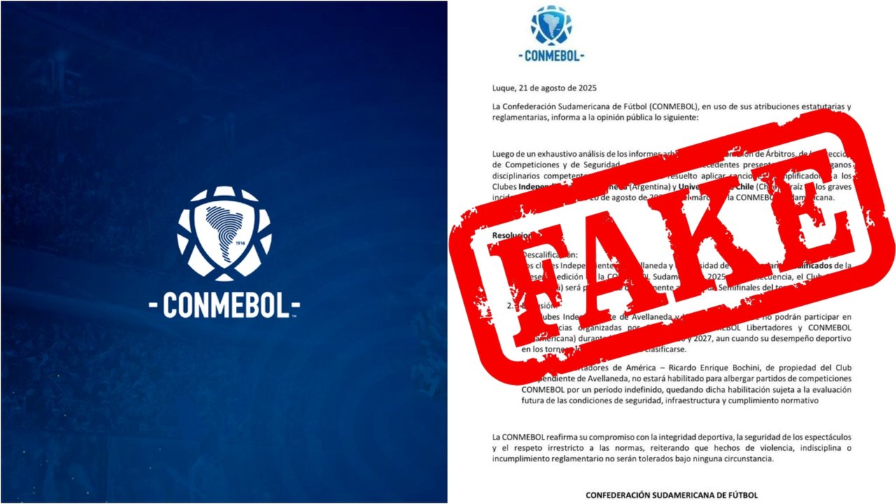 Según supo Noticias Argentinas, el comunicado apócrifo, que se difundió rápidamente en redes sociales, anunciaba la descalificación de ambos clubes de la actual Copa Sudamericana, la exclusión de todas las copas por dos años (2026 y 2027) y la suspensión por tiempo indefinido del estadio Libertadores de América.