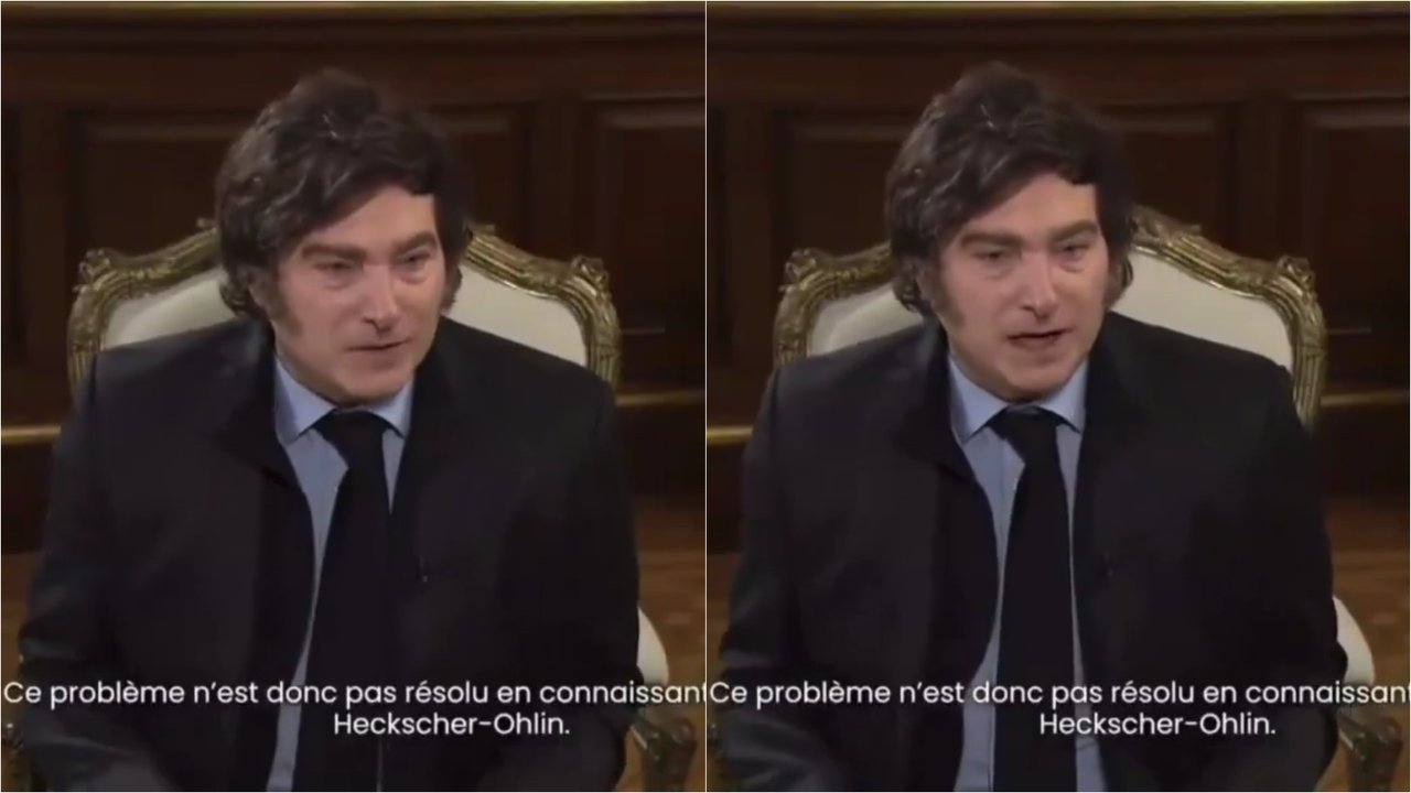 Según supo Noticias Argentinas, el momento viral ocurrió mientras el mandatario realizaba una compleja explicación sobre modelos económicos como el de “Heckscher-Ohlin” y el teorema de “Stolper-Samuelson”. En medio de su discurso, el video muestra cómo Milei ajusta su posición en la silla con un repentino gesto de sorpresa o incomodidad.