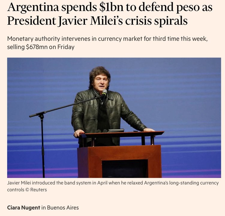 Ciara Nugent en Buenos Aires, para el Financial Times, informó que la autoridad monetaria vendió u$s 678 millones el viernes, u$s 379 millones el jueves y u$s 53 millones el miércoles, luego de que la moneda alcanzara el piso de banda de flotación. Milei introdujo este sistema en abril, al flexibilizar los controles cambiarios para obtener un préstamo de u$s 20.000 millones del FMI, que ahora constituye la mayor parte de las reservas del BCRA.