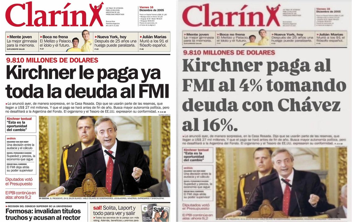 La tapa original de Clarín de diciembre de 2005, que se viralizó rápidamente para desmentir al Presidente, titulaba en realidad: “Kirchner le paga ya toda la deuda al FMI”. En la bajada de la noticia real, se explicaba que el pago se realizaría utilizando parte de las reservas del Banco Central, sin hacer ninguna mención a la toma de deuda con Venezuela o a las tasas de interés mencionadas por Milei.