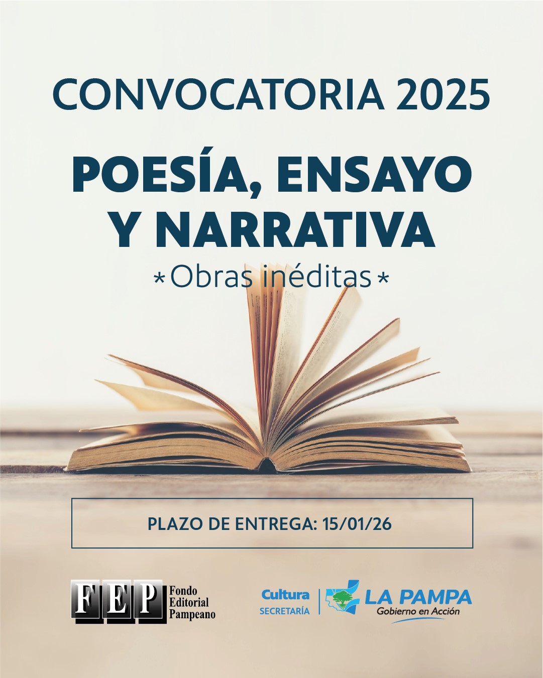 La Secretaría de Cultura a través del Fondo Editorial Pampeano (FEP), anunció que el próximo lunes se abrirá una nueva convocatoria para la elección y publicación de obras literarias inéditas de autores pampeanos, en sus géneros poesía, ensayo y narrativa.