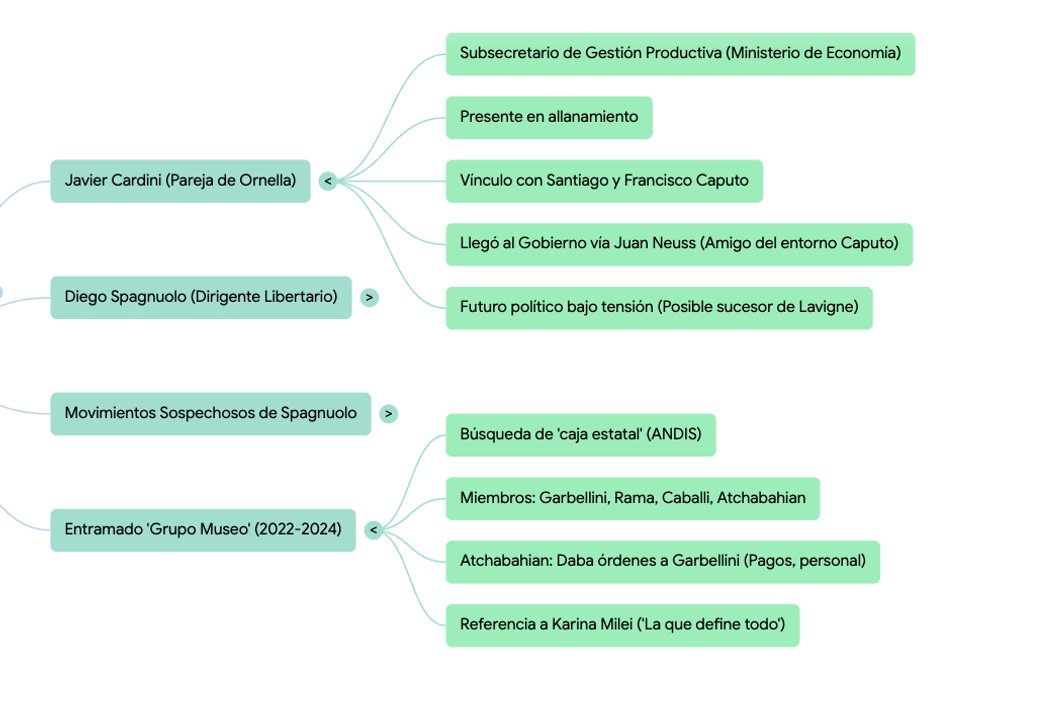 Javier Cardini: Pareja de Ornella y subsecretario de Gestión Productiva. Estaba presente durante el allanamiento. Tiene vínculos políticos de alto nivel y es cercano a los Caputo.
