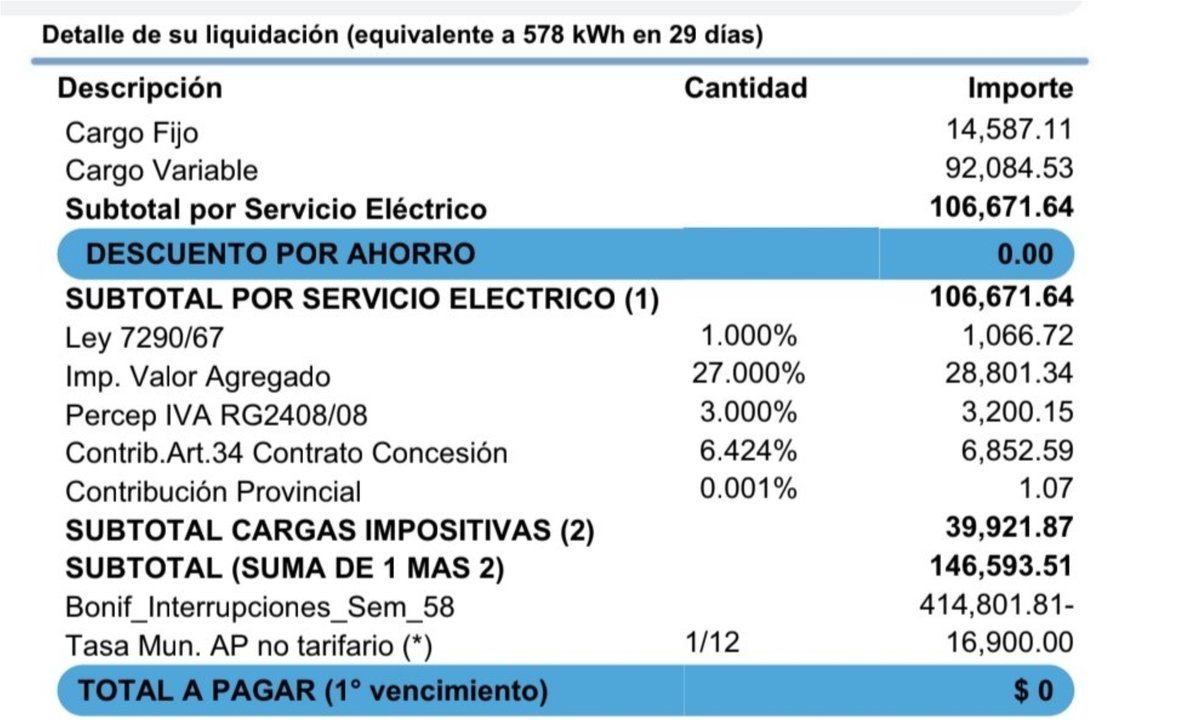 “Edesur este mes me devolvió 400 lucas por los cortes y los reclamos realizados”, publicó el usuario en la red social X, adjuntando una imagen de su liquidación. En la factura se observa un consumo elevado con un subtotal de $146.593, pero gracias a una “Bonif_Interrupciones_Sem_58” de $414.801,81, el total a pagar resultó ser de $0, quedando un saldo a favor para los meses siguientes.